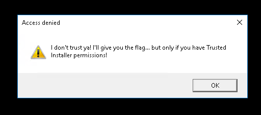 TrustMe.exeprogram on this Windows desktop “doesn’t trust me?”It says it will give me the flag, but only if I “have the permissions of Trusted Installer“…?